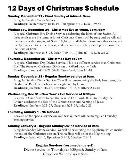 Wednesday, Dec 31 - New Year’s Eve Service at 6:30pm (Eve of the Circumcision and Name of Jesus)