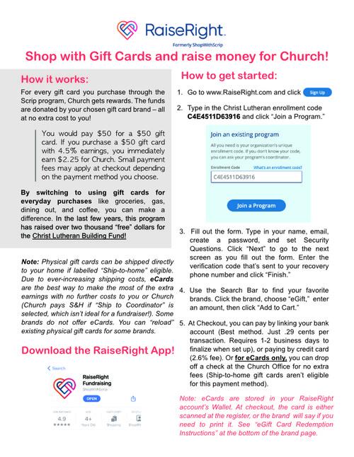 Many companies offer physical or e-cards. Some physical cards (such as Pick n'Save) are reloadable, so you can keep using the same card but still earn money for Church by reloading it on the app or online account.